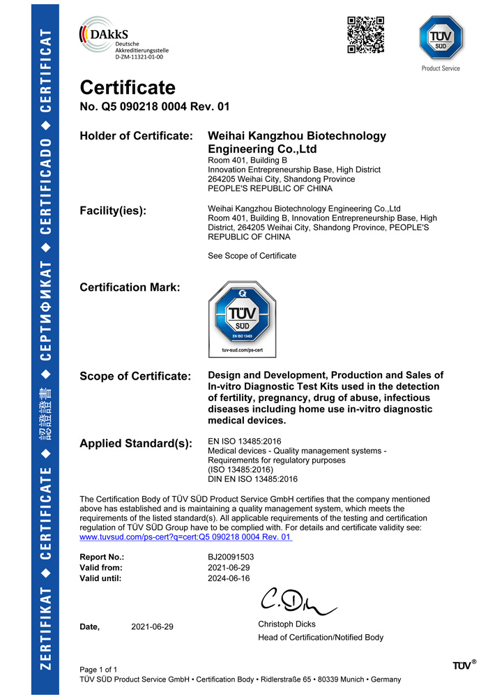 ? ? ?威海康州生物工程有限公司成立于2013年,公司坐落于風(fēng)景秀麗的海濱小城——威海市??抵萆锸羌邪l(fā)、生產(chǎn)和銷(xiāo)售于一體的生物科技公司,與威海哈爾濱工業(yè)大學(xué)合作研發(fā)團(tuán)隊(duì),擁有先進(jìn)的科研基地及生產(chǎn)基地。主要從事快速診斷檢測(cè)產(chǎn)品的研發(fā)、生產(chǎn)、銷(xiāo)售。產(chǎn)品涵蓋:生育檢測(cè)、藥物濫用檢測(cè)、農(nóng)藥殘留檢測(cè)以及其他臨床診斷檢測(cè)等。公司自主研發(fā)生產(chǎn)得早早孕試紙,排卵檢測(cè)試紙,毒品檢測(cè)及疾病檢測(cè)等醫(yī)用產(chǎn)品,經(jīng)過(guò)歐盟認(rèn)證,產(chǎn)品質(zhì)量穩(wěn)定,值得信賴(lài)。